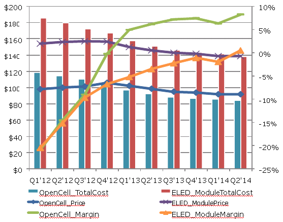 图一、Q1’12-Q2’14 TFT LCD八代线生产32” LCD TV 模块与Open Cell 成本与利润率比较