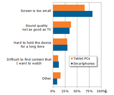 85%平板电脑用户和65%智能手机用户至少有部分时间通过移动设备收看在线节目,而非在电视机上收看。这这些用户中,大部分人表示他们喜欢移动设备可随时随地收看节目的便利性,且无需和其他人争夺电视遥控器。但即使如此,有15%平板电脑用户从未在移动设备上收看在线节目,主要原因是屏幕太小,音质没有电视好。同样的,35%的智能手机用户从未用智能手机收看在线节目,原因是屏幕太小、长时间拿着困难,以及音质欠佳。