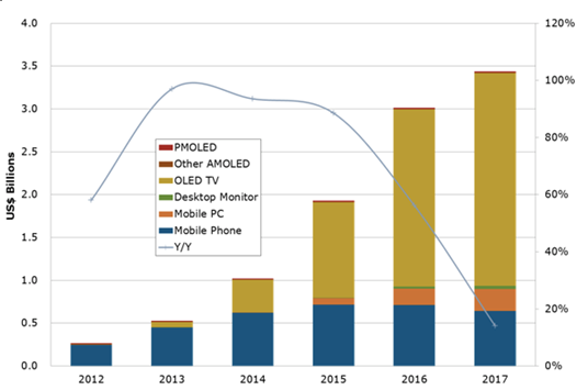 图一、2012-2017年 OLED 材料市场根据不同应用预估 (单位: 十亿美金)