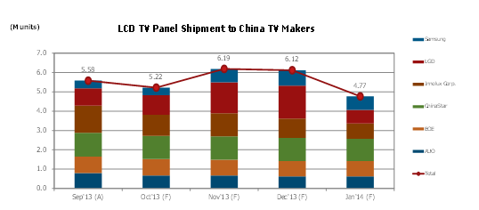 LG Display为中国大陆液晶电视面板第三大供货商。特别值得注意的是LG Display在今年最后两个月的出货计划非常激进,其Q4’13计划出货量较Q3’13成长率高达48%(Q/Q)。对于LG Display而言,要达到该目标,如何维持价格体系的稳定将面临较大挑战;如果目标达成,也将对主要竞争对手带来直接的压力。