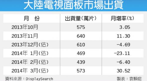 市调单位统计,去年11月出货至大陆的电视面板虽然较预期低约2个百分点,但依然是2013年单月出货量最高,达640万片,较前一个月成长11%。值得注意的是,韩国面板厂冲刺销售,LGD在11月超越群创,成为大陆最大电视面板供应商,群创位列第二,第三名是陆厂华星。