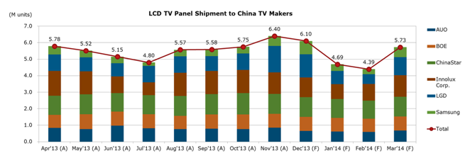 图一: 2013年4月-2014年3月出货至中国本土厂商电视面板数量走势(单位:百万片)