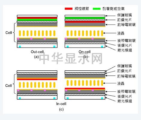 触摸面板需要“触摸线路(Sensorpattern)”来确定使用者手指点选的位置,触摸线路如果先制作在保护玻璃(Coverglass)上再以黏着剂贴合在面板(Cell)的前导电玻璃上方(也就是在Cell外面),则称为“Out-cell”,如图五(a)所示。