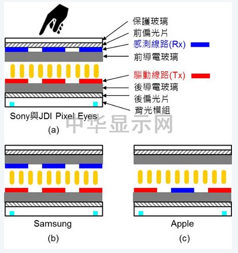 一般而言,驱动线路(Tx)都在后导电玻璃的上方,这样电力线才会由下向上投射出来,而感测线路(Rx)每一家公司设计的位置则不相同,Sony与JDI的“PixelEyes”把Rx制作在前导电玻璃的上方,如图二(a)所示;Samsung把Rx制作在前导电玻璃的下方,如图二(b)所示;Apple把Rx制作在后导电玻璃的上方,也就是与Tx制作在同一个地方,因此制程最复杂成本最高,如图二(c)所示。