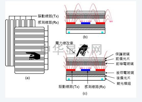 触摸线路(Sensorpattern)的驱动线路(Tx)与感测线路(Rx)到底要做在那里比较好呢?每一家公司各有自己的技术与专利,基本上各有优缺点,并没有决对的好坏,简单从图一(c)的液晶面板构造可以看出,能够制作触摸线路的地方不外乎前导电玻璃的上方或下方、后导电玻璃的上方三个位置。