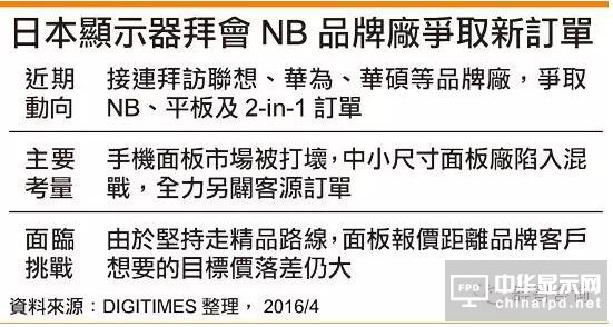以往专攻中小尺寸面板应用市场的日本显示器(Japan Display),产品及市场策略出现大转向,近期日本显示器派出日本团队,接连拜访联想、华为、华硕等笔记本电脑(NB)品牌大厂,希望争取包括NB、平板计算机及2-in-1产品等新品面板订单。不过,相关业者均不愿对客户及订单消息表示意见。