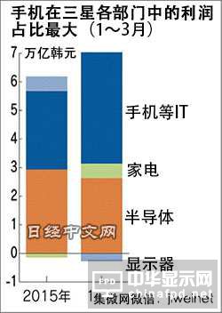 三星电子在中国举行的智慧手机新产品发布会(3月) 三星电子以智慧手机为核心的IT设备部门在1~3月盈利达到3万8900亿韩元,超过半导体成为盈利最高的部门。受到智慧手机部门的拉动,同期的合并营业利润达到6万6760亿韩元,同比增长12%。合并销售额也同比增长6%,达到49万7820亿韩元。实现了收入和利润的双增长。