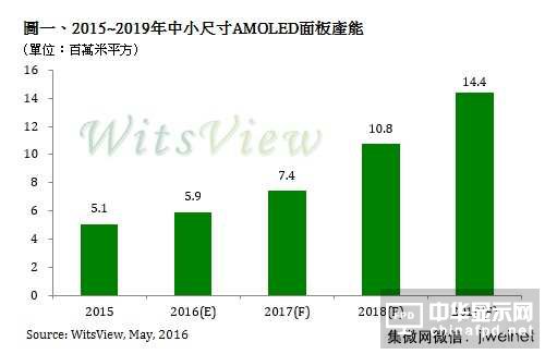 由于苹果在iPhone 系列采用AMOLED面板几乎已成定局,带起全球面板厂与手机品牌开始竞逐投资中小尺寸AMOLED 面板的热潮。TrendForce 旗下光电事业处WitsView 最新研究显示,2016 年全球中小尺寸AMOLED面板产能可望达到590 万米平方,较2015 年成长约16.5%。预期在各面板厂积极扩充产能下,2019 年中小尺寸AMOLED 面板产能面积将达到1,440 万米平方,2015~2019 年的年复合成长率高达30%。