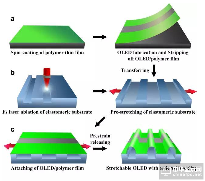 研究成果 基于SOLED面向可穿戴设备的重要应用前景,孙洪波和冯晶教授科研团队将高效率、高机械稳定性的SOLED作为研究目标,提出基于可编程的激光加工技术实现超薄OLED结合有序褶皱的可控拉伸方案,如下图: