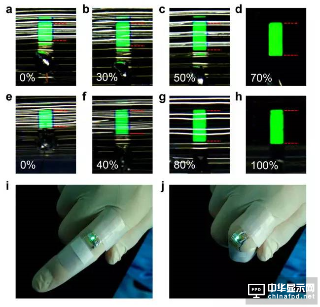 基于以上方案,该科研团队研制的SOLED在70%拉伸度下,器件效率为70 cd/A,拉伸15000次后器件性能下降小于16%,是迄今为止SOLED效率和机械稳定性的最高纪录。SOLED的拉伸度可达到100%,并可贴附于手指关节,如上图所示。这一制备方案具有工艺简单、成本低、与OLED制备工艺相兼容,材料和器件结构灵活等优点,为设计和制备具有更高效率的单色甚至白光SOLED提供了有效途径,因而推动SOLED在可穿戴设备应用领域向前迈进了重要一步。该工作得到国家自然科学基金资助。