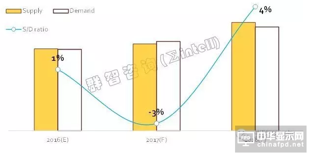 根据群智咨询(Σintell)供需模型数据显示,39.5~45英寸尺寸段的供需比呈现波段变化趋势,2016年供需比预计为1%,供应偏紧。而到2017年,因受SDC7代线部分关闭,40英寸供给大幅减少,43英寸和45英寸实际供应增长缓慢影响,39.5~45英寸尺寸段缺货风险大增;而2018年,随着多条8.5代和8.6代线陆续量产爬坡,43英寸和45英寸的供应能力明显增强,供需紧张将随之缓和。