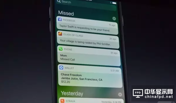 第一个是用户体验,拿起手机自动唤醒看到通知。日历的通知可以直接点击看到细节。通过3D Touch,短信在锁屏的情况下可以直接回复,第三方应用也可以在锁屏界面直接进入。重按屏幕,通知都可以直接清空。控制中心经过重新设计。比如,打开摄像头直接可以右滑实现。