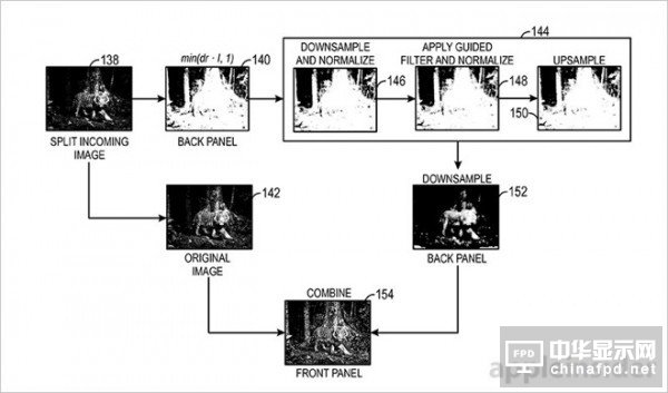 为此,苹果拿出专门的图像分裂算法。该算法分析图像并将其分成正面LCD和背面LCD面板显示的两个独立图像。根据图像内容,硬件限制和其他方面的考虑,该算法模糊传输给背面灰度LCD显示的图像,并且减小尺寸,使用由目标函数布置约束界定的优化方法,苹果这种算法系统能够防止视差而不影响亮度或清晰度。该算法还可以防止削波伪像和光绽放,或光晕出现在前面板上。苹果公司说,该技术可以用在小型和超大屏幕当中,产品覆盖范围从iPhone到Mac。