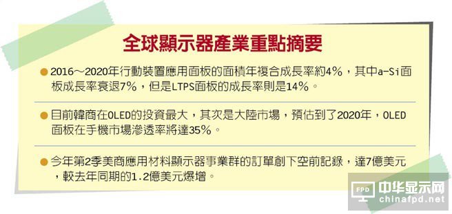 根据统计,2016年到2020年行动装置应用面板面积年复合成长率约4%,其中a-Si面板的成长率将衰退7%,但是LTPS面板的成长率则是14%,一部分的原因就在于OLED面板,而Oxide TFT面板的成长率约14%。今年可以看到各大品牌都会推出采用OLED面板的手机,预估到了2020年,OLED面板在手机市场渗透率将达35%,智慧手表的市场渗透率更高。