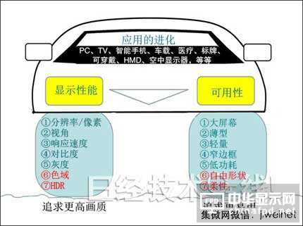 通过两条腿的协同动作,带动显示器产业实现大幅飞跃。在各7个特性中,标红的项目是各公司现在争相开发的对象。图片为笔者根据在SID上听到的内容制作。