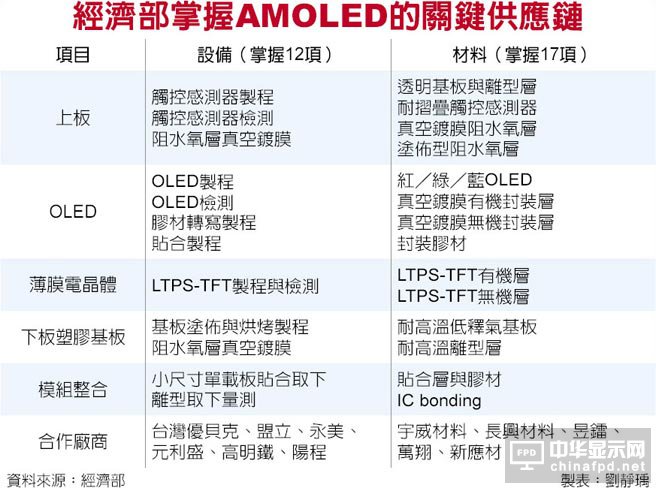 催生下世代软性显示技术(AMOLED),避免关键材料断炊,经济部砸新台币30亿元、耗时8年投入AMOLED技术开发,现已布局五大关键技术及群组,取得逾9成核心专利,明年关键设备与材料可100%国产化,应用于手机平板、穿戴式装置,预计2018年底促进投资额上看1,000亿元,未来每年面板业产值成长1,500亿元。