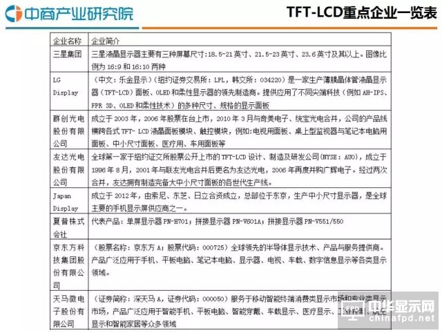 全球TFT-LCD重点企业主要有韩国LG Display、三星,台湾群创光电股份有限公司和友达光电股份有限公司,以及日本Japan Display,国内的京东方科技集团股份有限公司近些年业务增速很快。