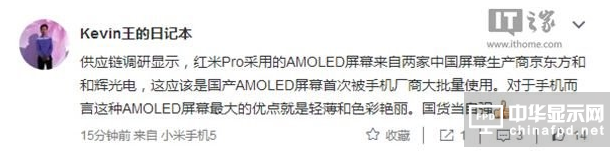 IHS Technology中国研究总监@Kevin王的日记本在微博上爆料称此次红米Pro上采用的AMOLED屏幕并非来自日韩企业,据供应链调查显示红米Pro采用的AMOLED屏幕来自两家中国屏幕生产商京东方与和辉光电,这应该是国产AMOLED屏幕首次被手机厂商大批量使用。对于手机而言这种AMOLED屏幕最大的优点就是轻薄和色彩艳丽。
