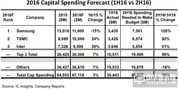 科技市调机构IC Insights 3日发表研究报告指出,今(2016)年全球半导体的资本支出虽然仅会年增3%、优于去年的2%年减率,但由于台积电、三星与英特尔都集中在下半年投资,因此下半年的资本支出总额有望较上半年跳增20%,而三巨头的支出成长率更将高达90%。相较之下,其他半导体业者下半年的资本支出却将比上半年萎缩16%。