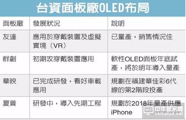 台资面板厂OLED相关布局,友达(2409)抢得头香率先量产;群创则紧追在后,今年底将完成软性OLED量产准备,预计2017年量产。华映则规划在福建莆田六代厂的第二阶段投产。而夏普获得鸿海注资后,预计2018年量产OLED面板,供应苹果iPhone。