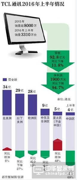 近年来,TCL通讯的重心多放在海外市场,上半年,北美、欧洲及拉美市场作为TCL通讯的前三大市场,销售额合计占比为83.7%。