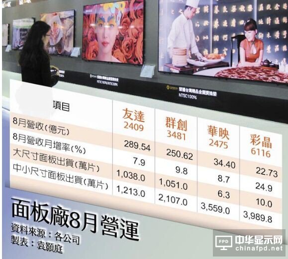 面板厂8月营收全数出炉,交出亮丽成绩单。群创大尺寸面板出货量成长超过1成,拉抬营收成长9.8%。彩晶营收成长最大,月增率24.9%,友达、华映也有8%的成长幅度。9月面板出货维持高档、面板价格走扬,面板厂营收可望再攀高。
