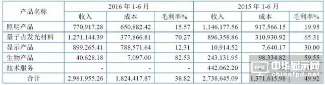 显示产品处于市场导入期,产量较低,物料损耗及固定费用的摊销导致显示产品的毛利率较低。报告期内公司显示和照明产品的销售收入占总收入的比重从去年同期的42.25%增加到56.01%。低毛利率的显示和照明产品销售占比增加,拉低了综合毛利率水平。