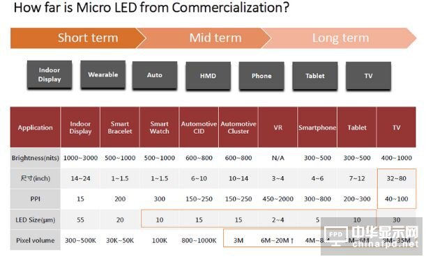 储于超认为,Micro LED除了显示应用外,还能创造更多附加价值,发展OLED或TFT-LCD难以进入的利基应用市场。LED inside依据市面上相关产品尺寸及ppi要求,推算出LED尺寸及像素数量,反映LED尺寸愈大、像素数量愈少的应用,实现商业化量产的速度可能相对较快。