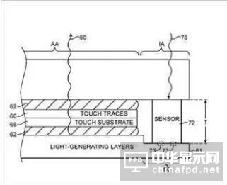 苹果建议在显示屏层上排列传感器。大多数具体实现在OLED或LCD显示屏层上排列传感器,部分具体实现把传感器排列在设备显示屏周围,避免引发显示屏触摸不灵敏问题。