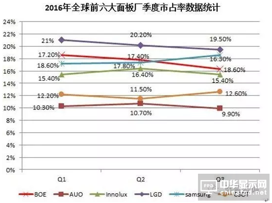根据群智咨询(Ʃintell)调查数据统计,从2016年全球LCD TV面板季度出货量来看,京东方第三季度出货量在千万片以上,位列全球面板排名前三位;从全球面板市场占有率来看,京东方Q1以18.6%和Q2以17.8%的市场占有率处于第二位;京东方Q3全球市占率下滑到16.3%,被Samsung超越,位列第三,京东方之所以在第一二季度之后下滑,主要不是京东方自身的原因,而是Samsung在Q1和Q2因制程转换、良率等因素,拖累了出货量而不及京东方,当Q3季度产能上来后,以应有的实力跃居第二位。如图: