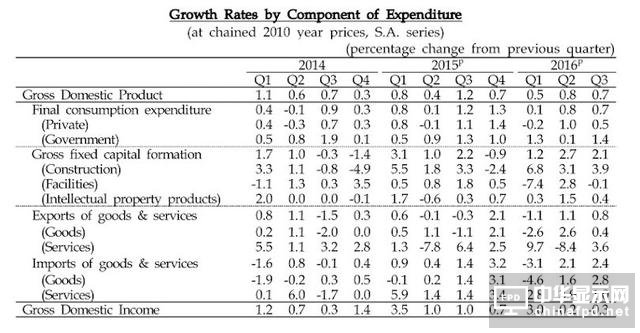 据韩国银行称,第三季度的私人消费增长了0.5%,低于第二季度1%的增长率;在住宅和非住宅建筑同时增长的推动下,第三季度的建设投资增长了3.9%,超过了之前的建设投资增长率纪录3.1%。