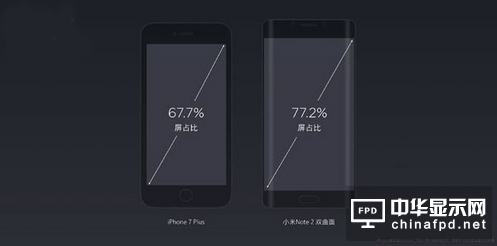 采用曲面屏的另外一个好处在于,小米可以做到更好的屏占比,与苹果iPhone7 Plus相比小米Note2屏占比增加了近10%,达到了77.2%,这款屏幕比传统的LCD屏幕相比贵出6倍。