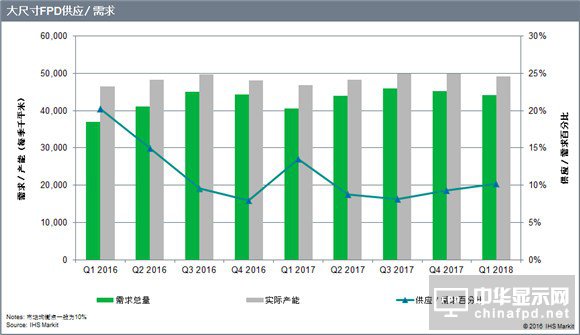 2016年第1季度,由于中国产能提升和市场季节性需求疲软,面板供应超过需求的20%;