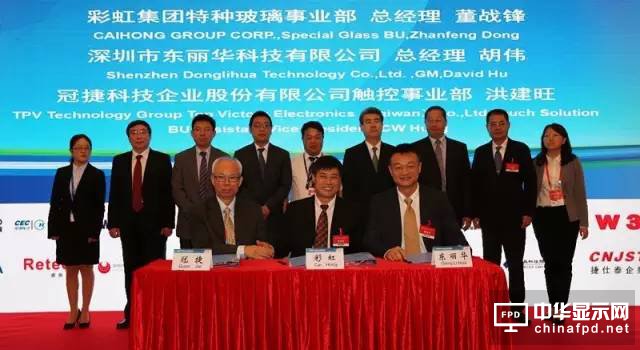 会上,中国电子彩虹集团特种玻璃事业部总经理董战锋分别与深圳市东丽华科技有限公司总经理胡伟、冠捷科技企业股份有限公司触控事业部协理洪建旺签署战略合作协议。