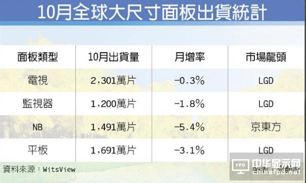 根据市调机构的调查,由于中国大陆、北美年底节庆促销备货需求持续增温,加上美国公家和军事部门PC换机潮支撑,10月大尺寸面板出货量为6,683万片,仅小幅衰退2.4%。其中京东方策略性冲刺NB面板出货,首次挤下LGD,跃居NB面板出货龙头。