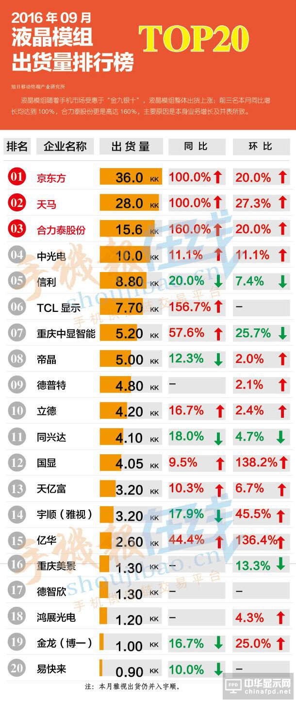 北京时间11月30日消息,中国触摸屏网讯, 2016年9月液晶模组出货量排行榜, 液晶模组随着手机市场受惠于“金九银十”,液晶模组整体出货上涨;前三名本月同比增长均达到100%,合力泰股份更是达到160%。主要原因是本身业务增长及并表所致。
