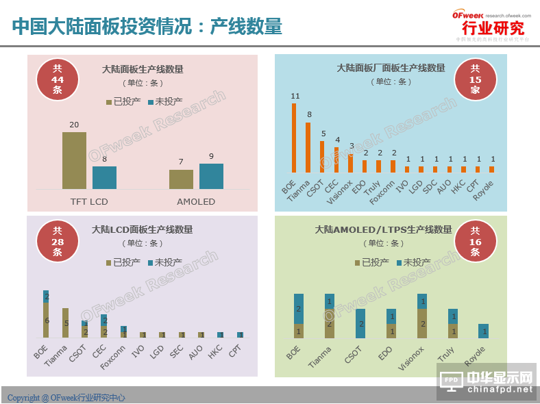 目前,国内面板厂商共有15家,包括TFT LCD 和AMOLED技术。从产线数量上看,已投产LCD生产线有20条,未投产有8条;OLED生产线目前已投产有7条,未投产有9条。