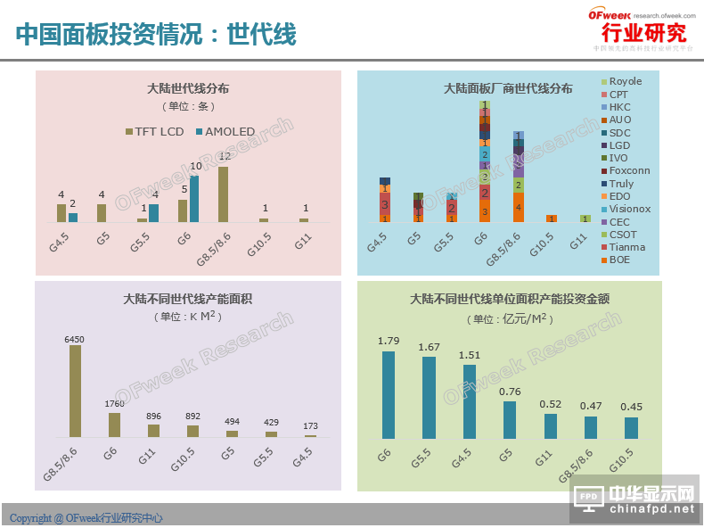国内面板厂商投资近几年非常火热,根据OFweek行业研究中心的统计,国内目前为止已投产的面板生产线数量为27条,在建和规划中的生产线还有17条,预计到2018年,全国可投产面板生产线将高达44条。下面通过几张图让大家360度全方位了解国内面板投资状况。
