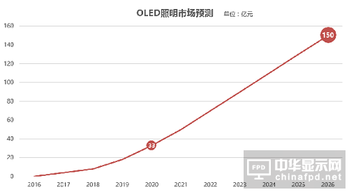 照明一直被认为是发展非常缓慢的行业,直到20世纪90年代LED、OLED的出现,才正式拉开了现代照明发展的序幕。此后,OLED照明在全球照明市场中的占有率开始逐年增长,据IDTechEX预估,2026年OLED照明市场将达到150亿元(约2.2 billion USD)。