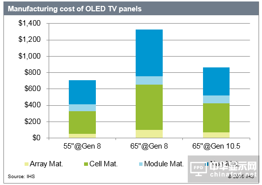 65英寸面板的高昂制造成本很可能是过低的玻璃基板效率所致。在8代线,基板利用效率仅有64%,而55英寸面板则可达到92%。目前8代OLED产线的玻璃基板尺寸并不适合生产65英寸面板。一片玻璃基板可以生产六片55英寸面板,但只能生产三片65英寸面板。两片55英寸面板的造价与一片65英寸的造价相当,这就是65英寸面板成本价格几乎超过55英寸面板两倍的主要原因。
