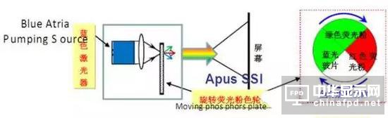 激光荧光粉显示技术是采用单色激光(即蓝光激光)结合含有红绿等荧光粉的多种颜色旋转荧光粉色轮技术而产生红蓝绿三基色。激光荧光粉光源技术攻克了激光显示在效率和可靠性方面的最根本的技术难关。激光荧光粉显示技术的应用,解决了激光显示在成本、环保和用户体验的问题。不过,荧光粉激光投影机由于其光源性质,只能用单片DLP来实现,由于单片性质无法应用于大屏市场。同时在色彩准确性上还有一定的欠缺。