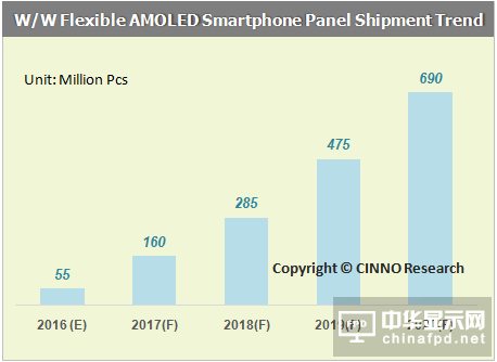 根据 CINNO Research 全球季度手机面板出货量监测统计分析报告显示,2016 年全球 AMOLED 手机面板出货量达到 3.7 亿片,相比 2015 年增长 41.2%,而中国前十大手机品牌中的 OPPO、vivo、华为、金立、魅族、联想等即贡献了 26% 的份额。