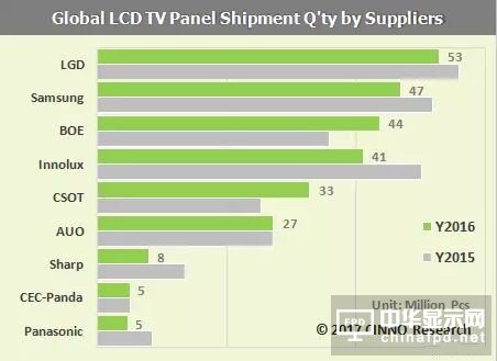 京东方2016年液晶电视面板出货量超过群创,由从2015年排名第四跃升到第三位;华星光电液晶电视面板出货量则超越友达,从2015年的出货量排名第六位上升到第五位。