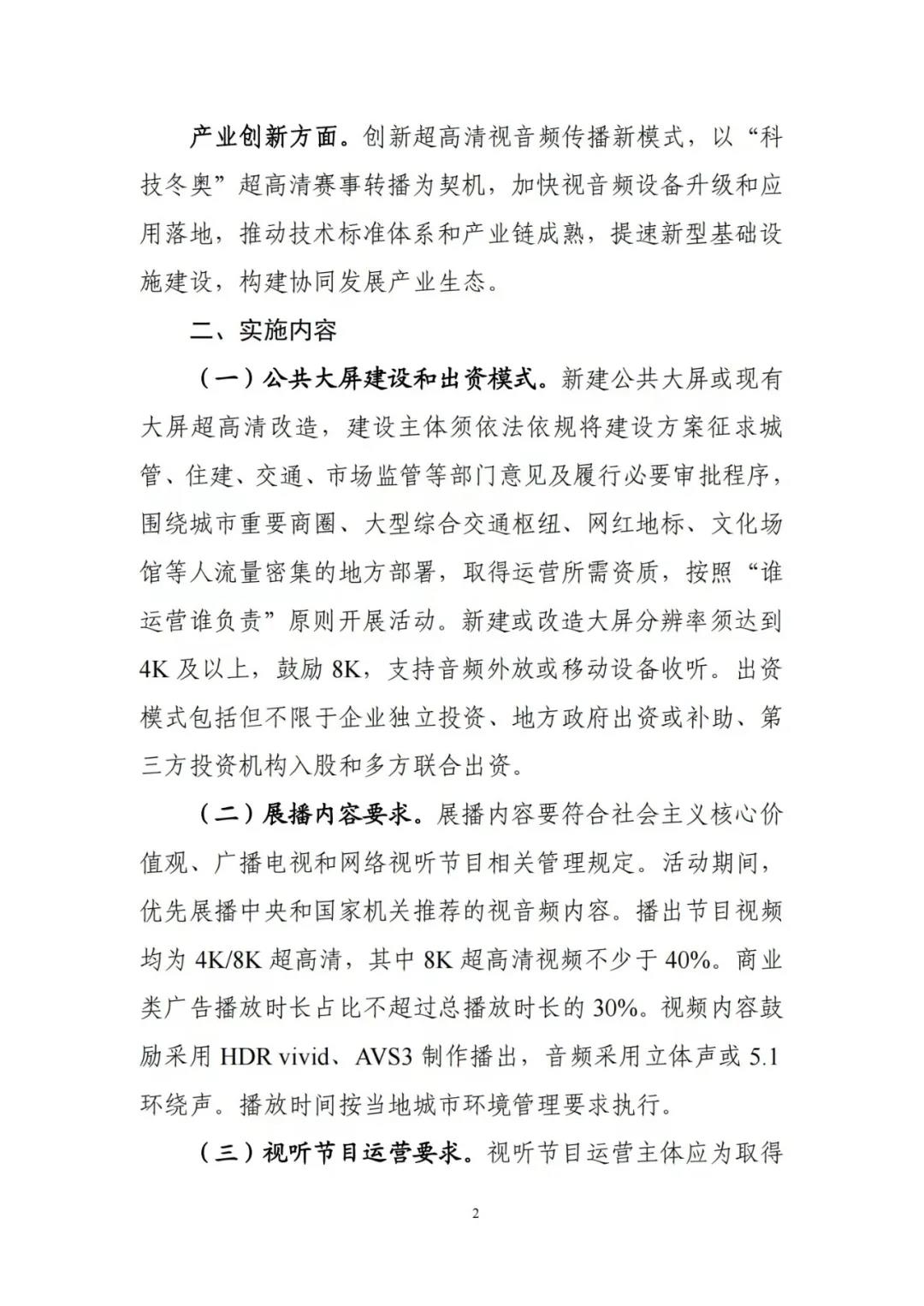 按照《关于开展“百城千屏”超高清视频落地推广活动的通知》(工信部联电子函〔2021〕271号)部署,为确保“百城千屏”活动取得实效,工业和信息化部、中央宣传部、交通运输部、文化和旅游部、国家广播电视总局、中央广播电视总台等六部门近日联合印发《“百城千屏”活动实施指南》。“百城千屏”活动以试点示范工程为引领,通过新建或引导改造国内大屏为4K/8K超高清大屏,丰富超高清视音频服务场景,加速推动超高清视音频在多方面的融合创新发展,催生新技术、新业态、新模式。