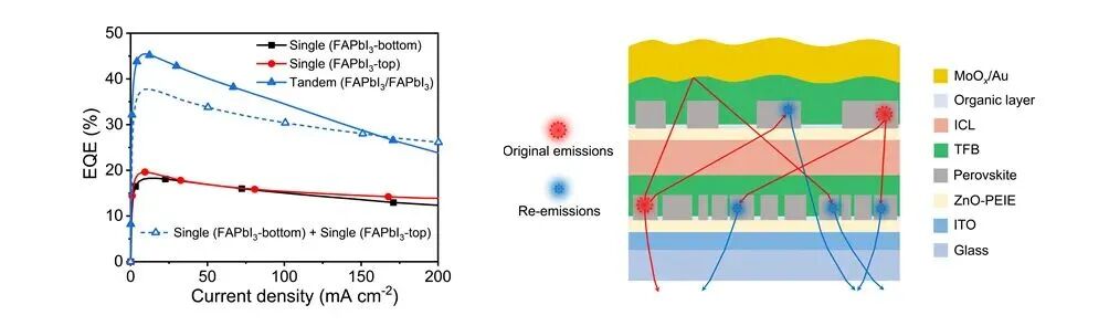 针对这一世界性难题,团队通过优化连接层结构,实现了叠层器件中高效的电荷注入与平衡。更为重要的是,通过调控钙钛矿发光层的微纳结构,创新性地提出利用叠层器件中独特的层间光子循环效应的策略,即一个发光单元产生的光子可被另一钙钛矿层重新吸收并再次发射,从而突破了传统光提取效率的限制。该策略使叠层钙钛矿LED器件效率超越了单结器件效率的简单叠加,实现了“1+1>2”的效果,所制备的LED器件外量子效率达到45.5%,在100 mA cm-2电流密度下仍保持34.5%的高效率,再次创造了钙钛矿LED发光效率的世界纪录。
