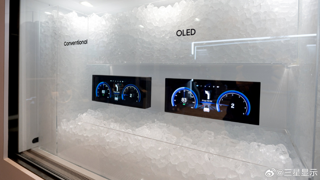 三星显示还在现场展示了车载OLED屏幕在冰箱模拟的极寒环境中持续运行,直观展现三星OLED的耐用性。在此环境下,OLED能瞬间响应电信号,即使在-20°C环境下仍保持0.2毫秒响应时间,与室温表现相当。相比之下,液晶屏在相同条件下响应时间可能延长至200毫秒。该延迟相当于时速100公里行驶约2.8米,意味着OLED能更有效保障行车安全。