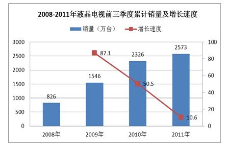 1、2011年液晶电视前三季度同比增长10.6%,2009年、2010年同期这一数据分别为87.1%、50.5%,速度明显放缓。