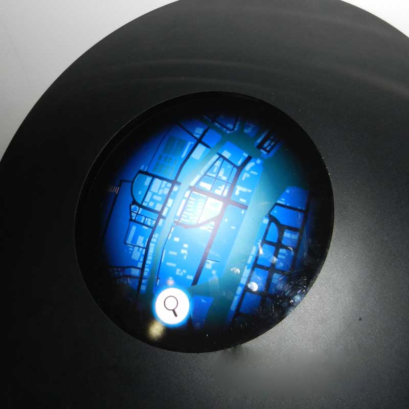 背投型显示器的开发产品从背面向半球状屏幕投射影像。在屏幕上组合使用光学式触摸传感器,可以用手触摸屏幕表面显示的地图进行滚动变换,或者通过手写输入来搜索。滚动地图时犹如转动地球仪的新鲜感。