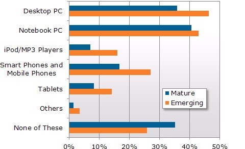 NPD DisplaySearch全球电视消费者换机调查还对家庭户进行了关于在其他设备上收看电视视频节目的调研,发现在新兴市场越来越多的家庭使用除电视以外的设备,包括平板电脑、智能手机和MP3播放器。