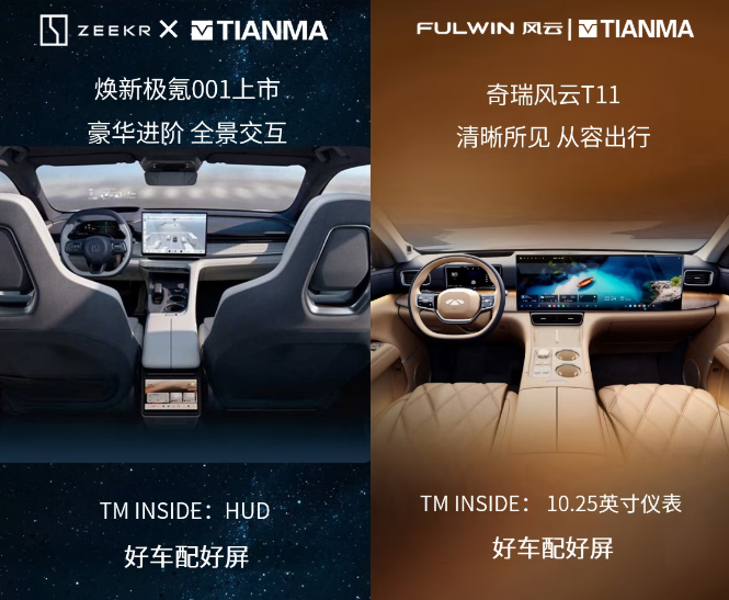 还有焕新极氪001,搭载天马HUD;奇瑞风云T11搭载天马10.25英寸仪表。